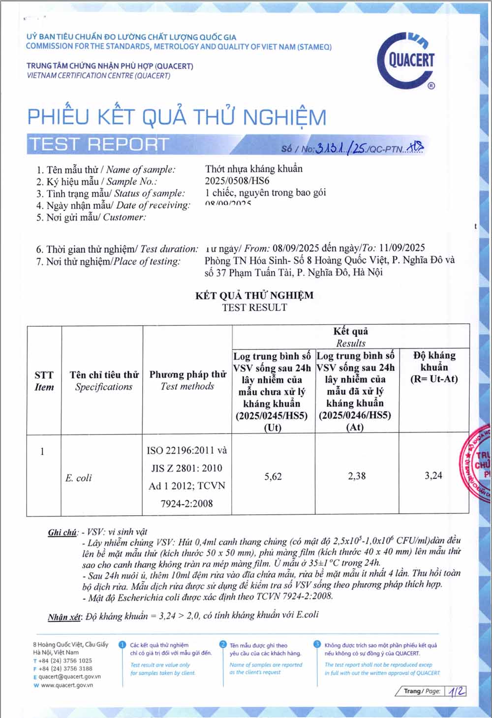 Phiếu kết quả kiểm nghiệm thực hiện tại Thunghiem247.com