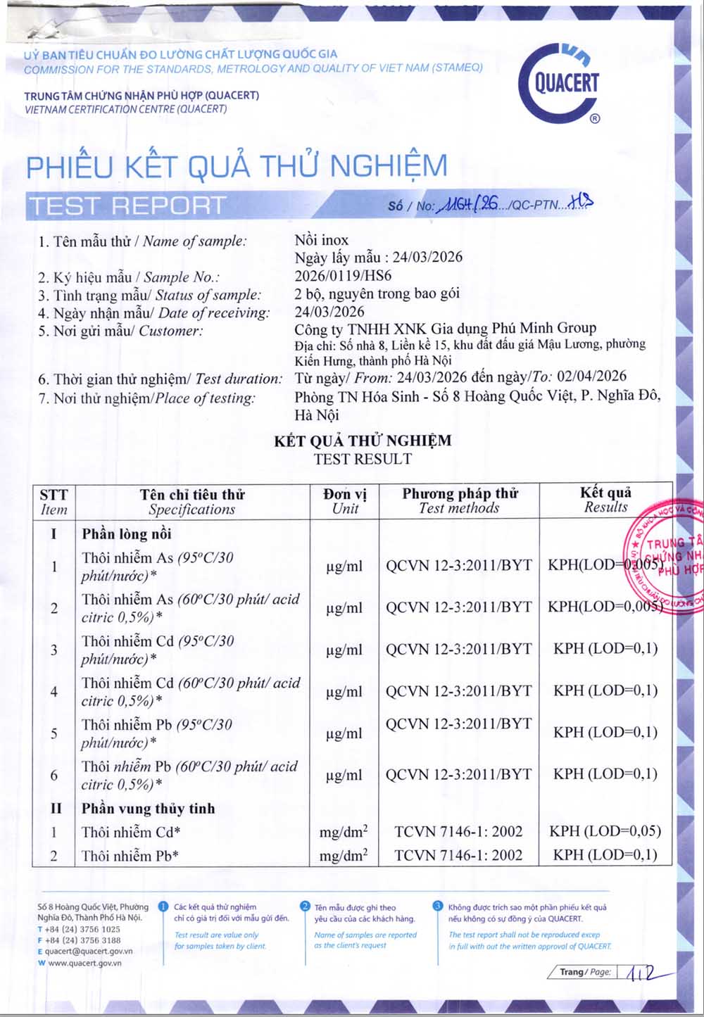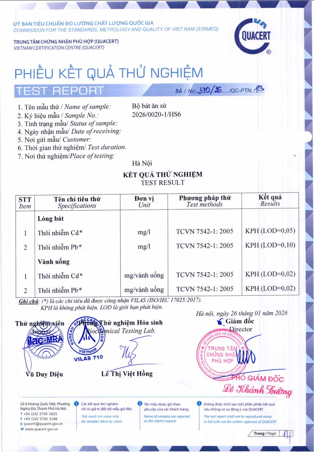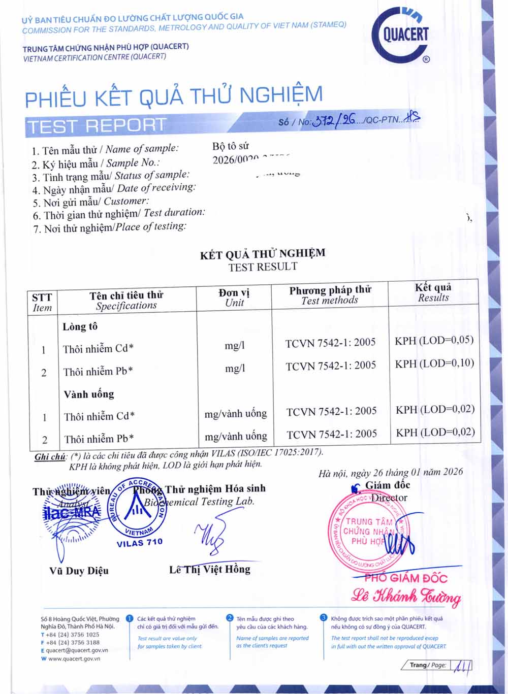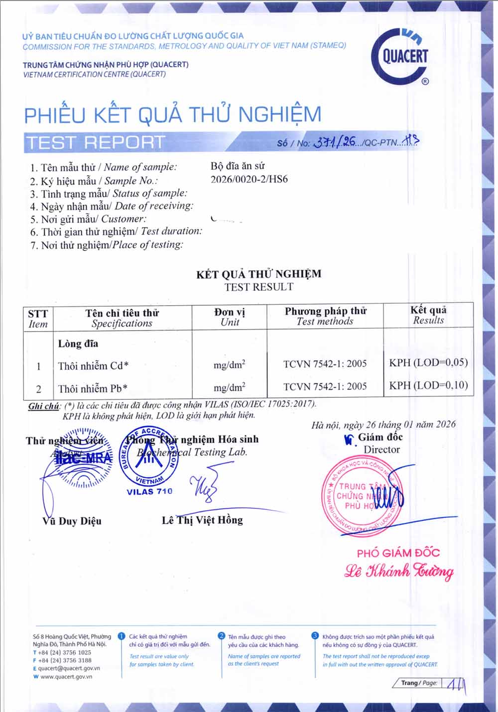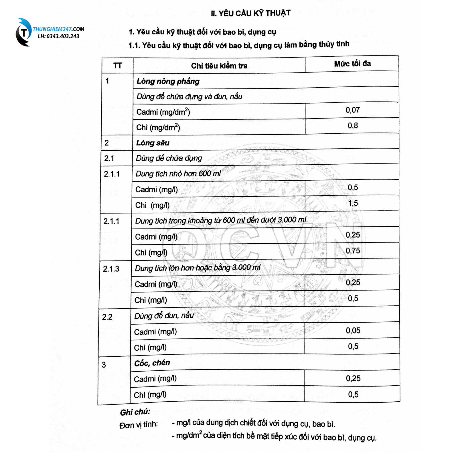 Phiếu kết quả kiểm nghiệm gốm sứ thuỷ tinh đựng thực phẩm thực hiện tại Thunghiem247.com