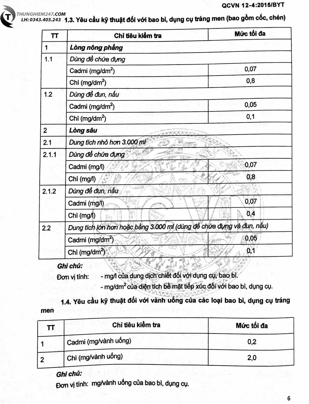 Theo quy định hiện hành thì những chỉ tiêu kiểm nghiệm gốm sứ thuỷ tinh được căn cứ vào văn bản pháp lý QCVN 12-4:2015/BYT: Quy chuẩn kỹ thuật quốc gia về vệ sinh an toàn đối với bao bì, dụng cụ làm bằng thủy tinh, gốm, sứ và tráng men tiếp xúc trực tiếp với thực phẩm